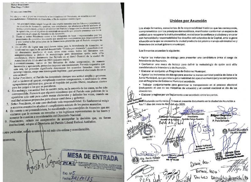 El dirigente señaló que ese esfuerzo se materializó con la creación del espacio “Unidos por Asunción”, conformado por referentes del liberalismo y otras fuerzas opositoras, quienes firmaron un documento de compromiso el 11 de abril de 2025, en el Hotel Guaraní. En ese acuerdo, los firmantes se comprometieron a definir una metodología conjunta para seleccionar al candidato o candidata que representaría al bloque.